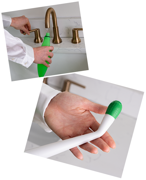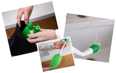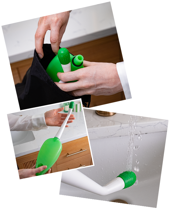 Our signature bristled nozzle is like a toothbrush… for your tush. Gently scrubs, if necessary, to finish the job.